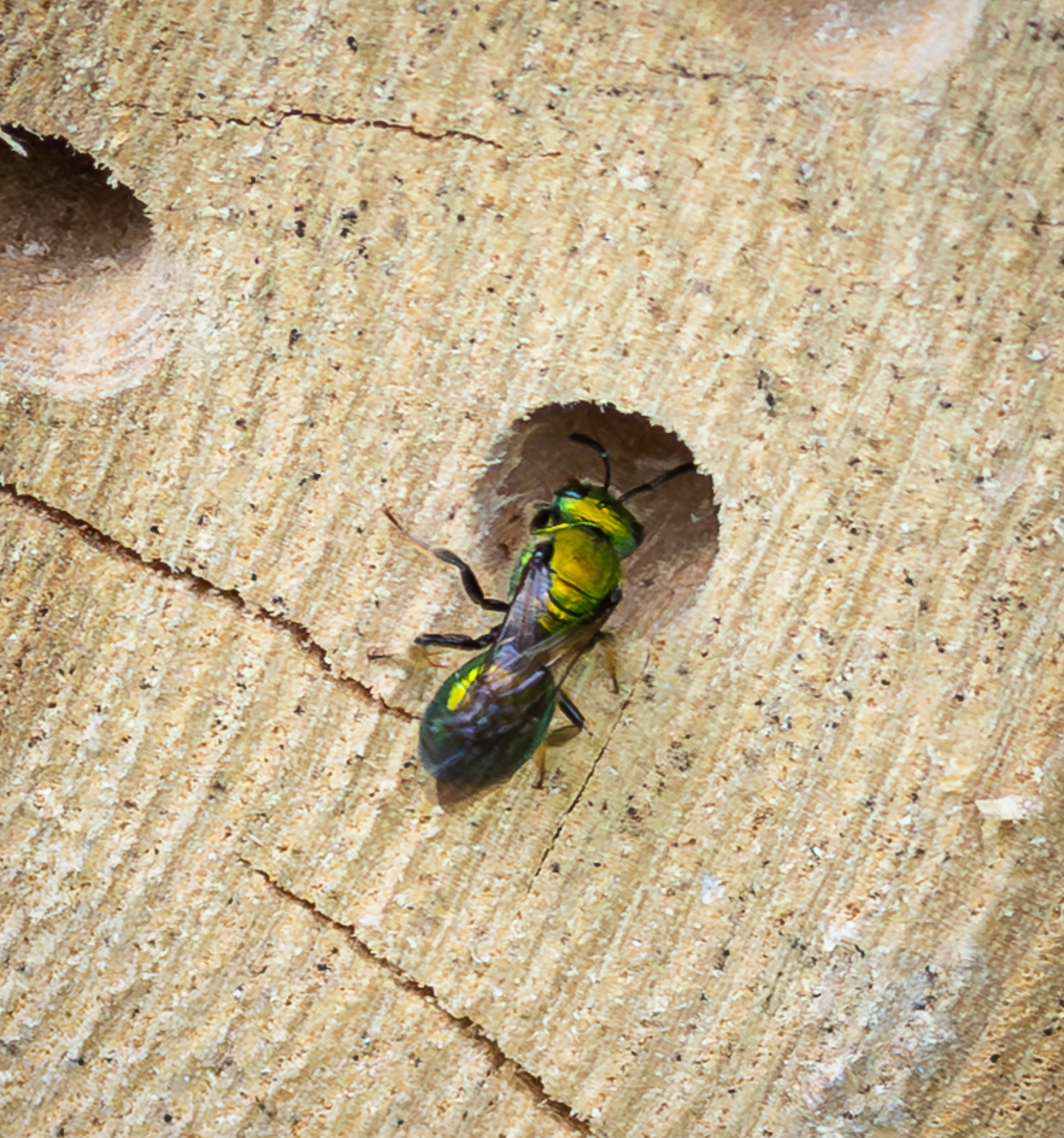- A cavity-nesting bee flying in and out of the drilled logs where it deposits its eggs with food (a bit of pollen)