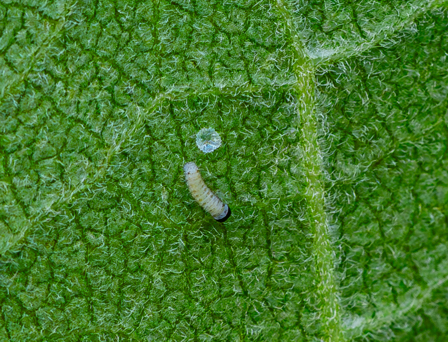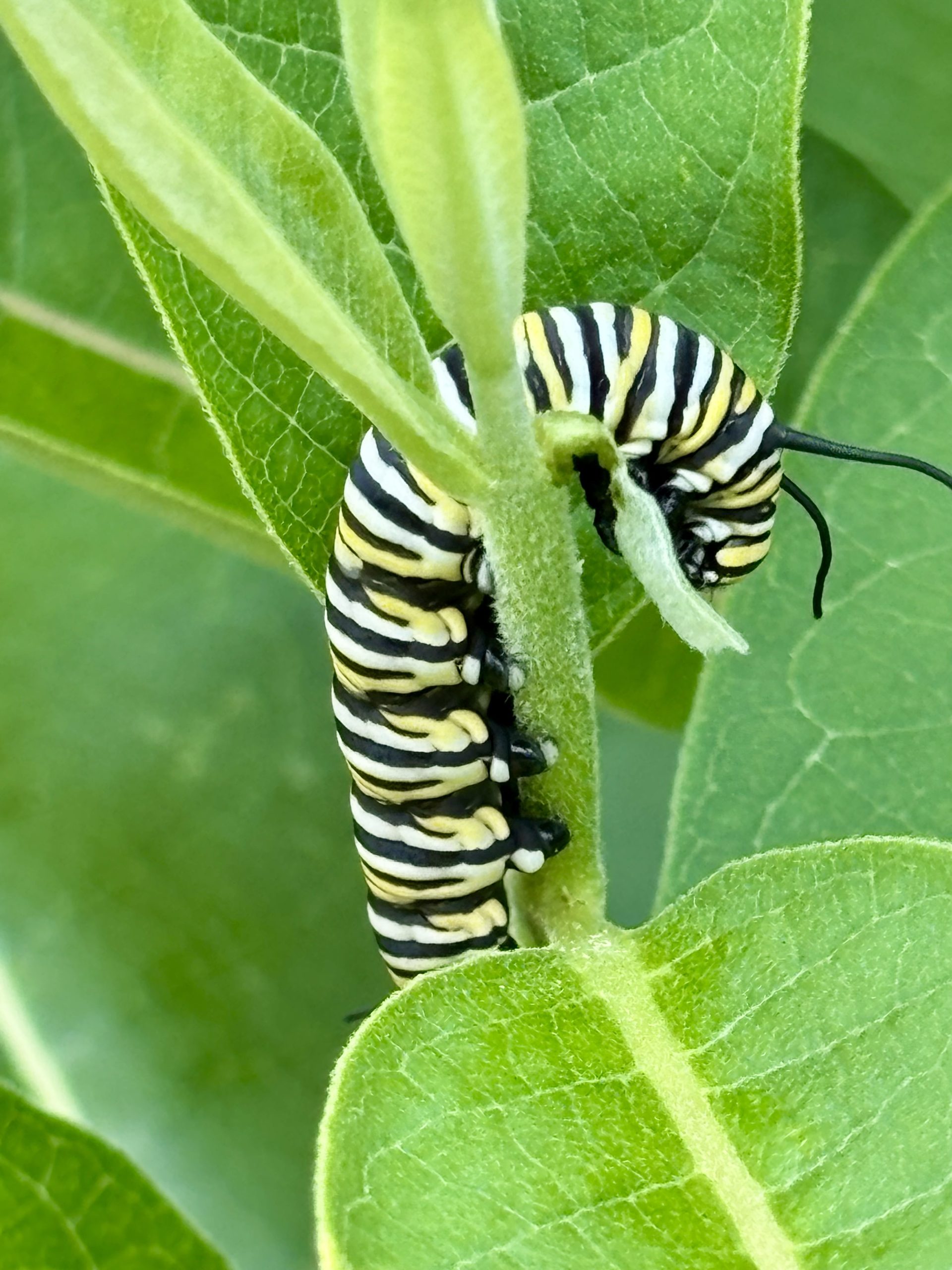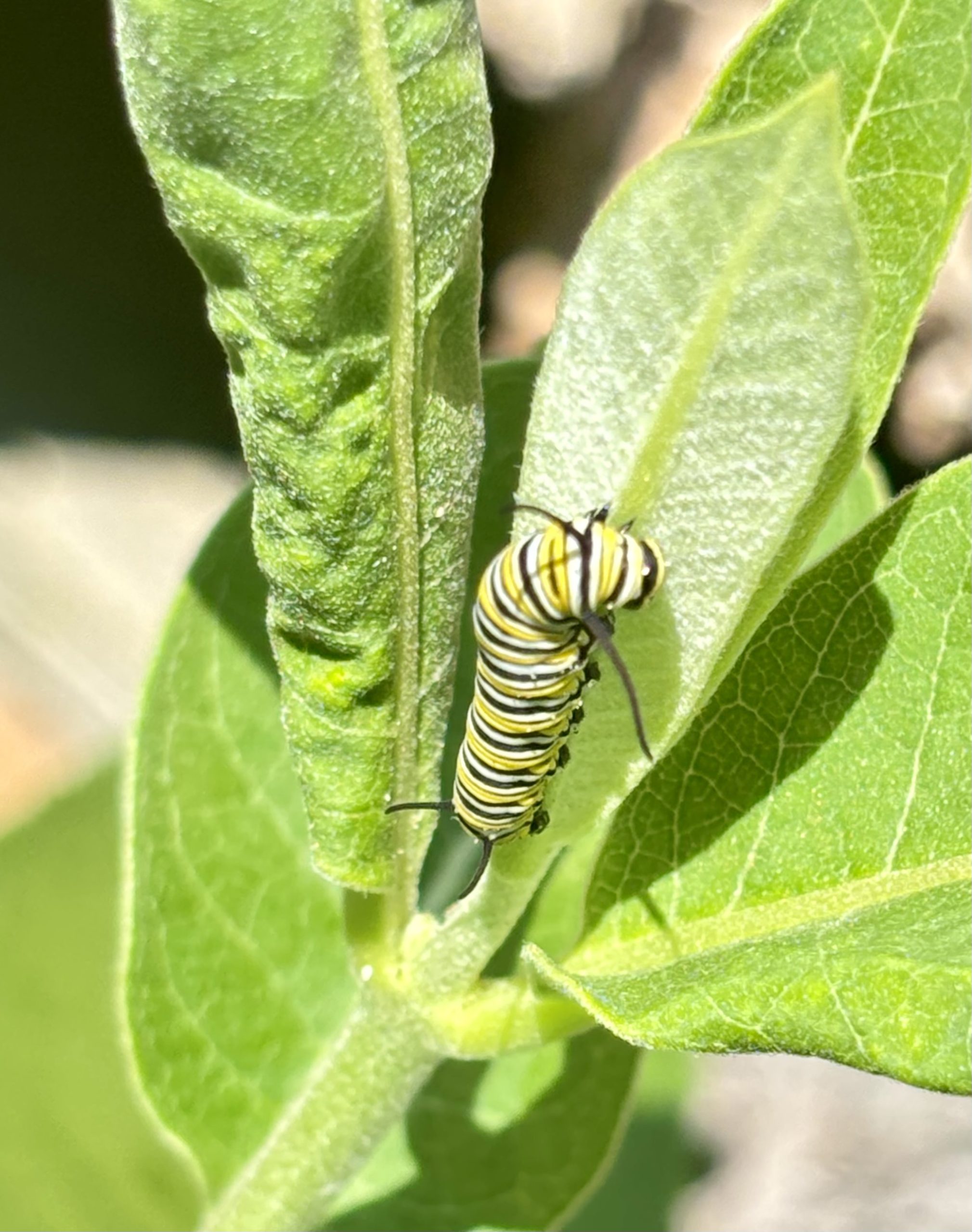 - A Monarch caterpillar hiding under the leaf of a milkweed plant